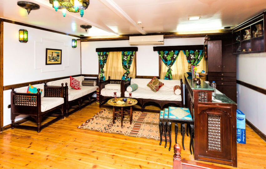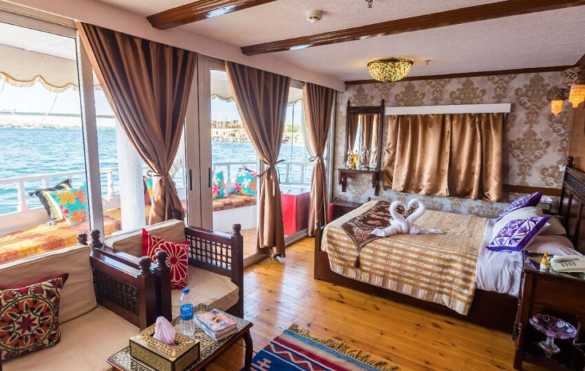 Amoura Dahabiya Nile Cruise is a beautiful river boat with six professionally designed cabins. It comes with panoramic windows so guests can watch the scenery go by in complete privacy from their room. Two people can stay in each cabin at the same time.