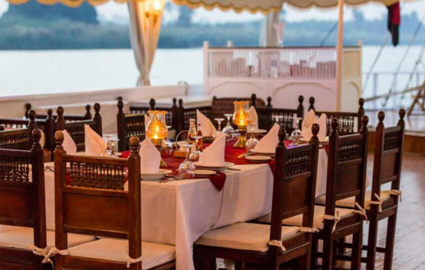 When we finally get close to the Speos of Hormheb, you're going to be shocked. If at all possible, dinner will be served on the lit-up temple grounds or on the top deck. During their meal, guests will be able to take in the peaceful atmosphere and listen to music that was chosen to fit the setting.