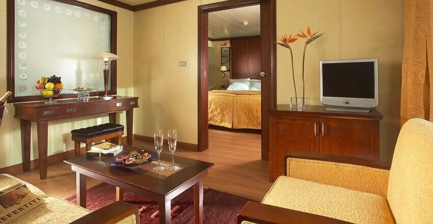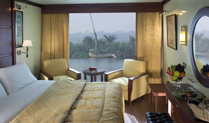 H/S Kon Tiki Nile Cruise was made for people who want to have a luxurious time on the Nile. The HS Kon Tiki Nile cruise can actually hold up to 150 people. The Nile river cruise ship sets sail from Aswan for three-night trips and from Luxor for four-night trips. The cruise line also has a seven-night Nile cruise that starts in Aswan and ends in Luxor. On the HS Kon Tiki Nile trip, there are 70 cabins, and you can choose to stay in a Standard, Deluxe, or Suite cabin. There are a total of 68 rooms, including 64 standard cabins, 4 suites, and 2 panoramic suites. The rooms and cottages are very high-end, but they still have a cozy feel.