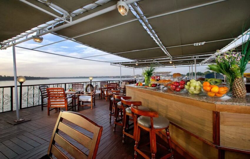 The huge lounge bar is decorated luxuriously throughout and serves drinks from throughout the globe. At night, you may see performances of Egyptian traditional music and belly dancing in the main area, which also has a sound system and a dance floor for your convenience. The main ballroom serves as the venue for these performances. Bar patrons may relax on plush Chesterfields while taking in stunning views of the Nile from their own private space. Come here to relax with a good book at the end of the day and ease your mind before drifting off to sleep.